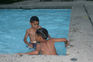 This is something that happened this a.m. when Mike took the boys up to the pool. He didn't put his swim trunks on as usual they last 10 - 30 minutes and it was colder this a.m. Anyway they came back and got their clothes back on. Mike sat down and said there were some other kids in the pool this time and the boys played with them. He said Eli really liked this one boy about his age and played with him. The boy got out, walked around the pool and jumped back in. So did Eli.....Eli can't swim! Eli could stand but the water was to the underside of his nose. Mike got him from the side and pulled him out.